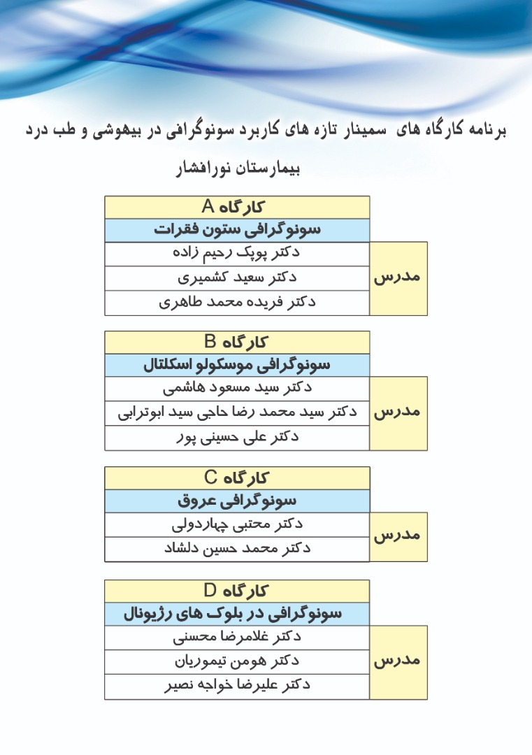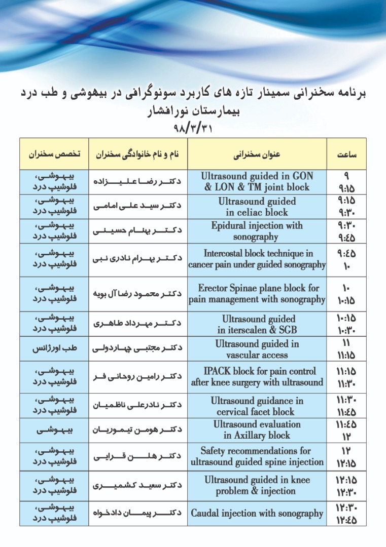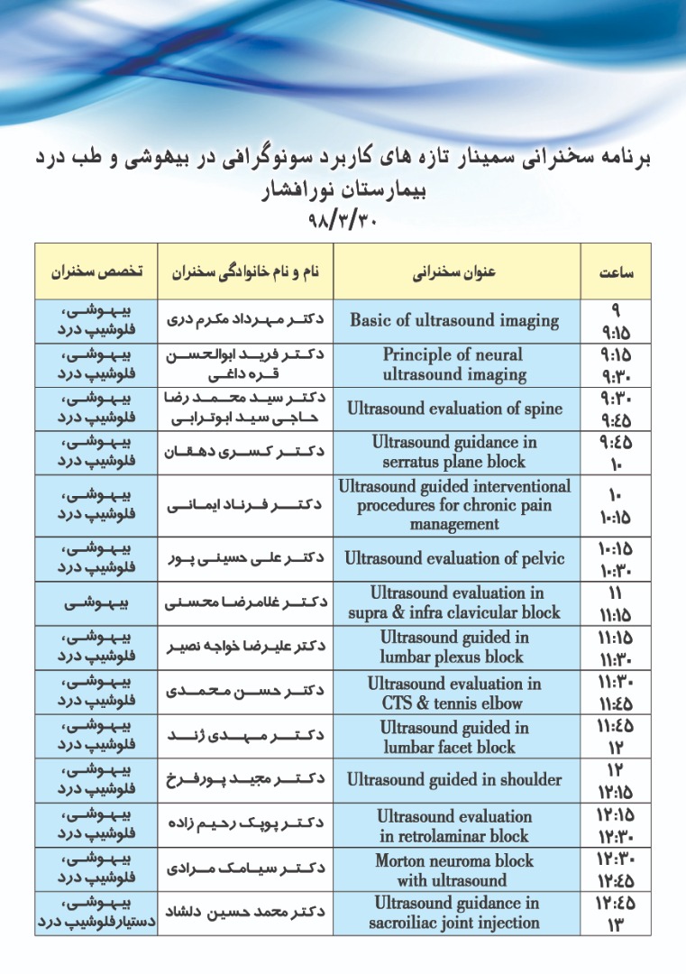 انجمن درد ایران با همکاری دانشگاههای علوم پزشکی شهید بهشتی، تهران و ایران اقدام به برگزاری “پنجمین سمینار تازههای کاربرد سونوگرافی در مداخلات درد” در تاریخ ۳۰ و ۳۱ خرداد ۱۳۹۸ در سالن همایش بیمارستان نورافشار نموده است. این برنامه شامل دو بخش سخنرانی و کارگاه خواهد بود.